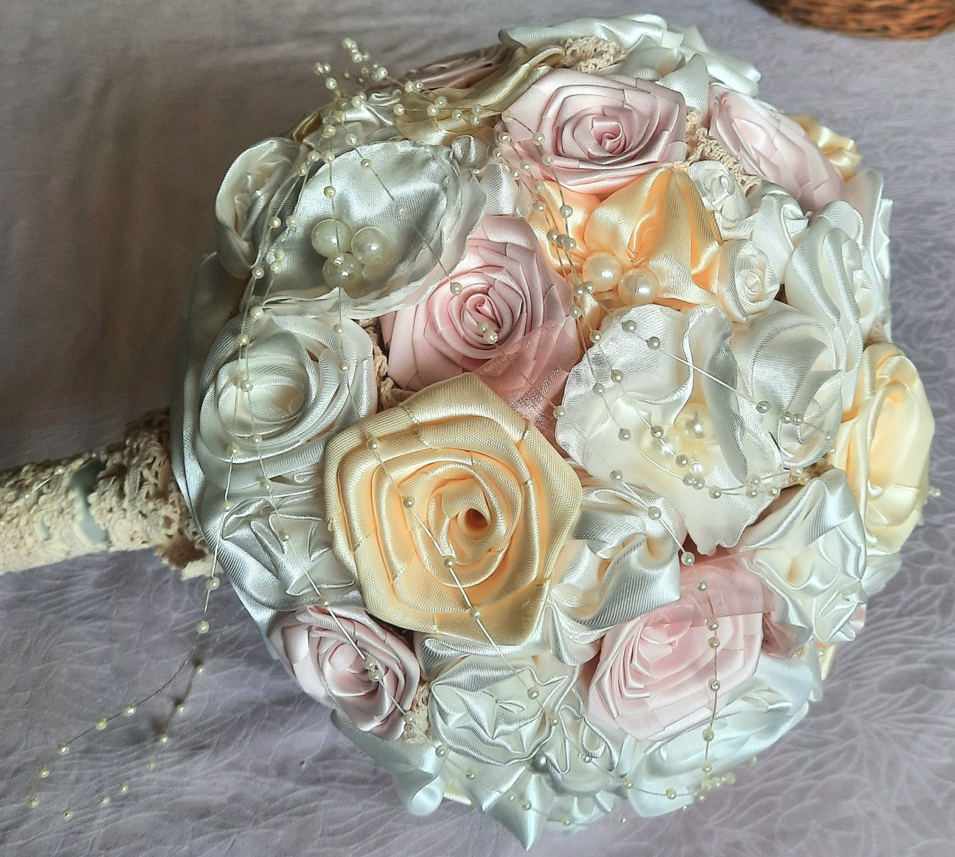 Szatén virágcsokor esküvőre, ballagásra, lakásdekornak. Krém-púder-ekrü színekben.